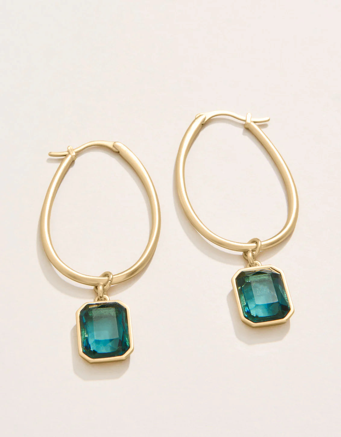 Our Chateau Hoop Earrings feature faceted stones intricately framed in 18kt matte gold plating, dangling from golden hoops. Bonus, remove the drop for a simple gold hoop. 2-looks-in-1!