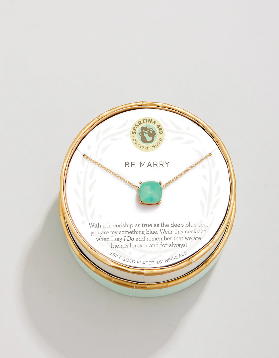 Wear our Be Marry Necklace as a reminder that we're friends forever. Featuring a sea foam blue pendant, this special piece comes packaged inside a beautiful box with the message: "With a friendship as true as the deep blue sea, you are my something blue. Wear this necklace when I say I Do and remember that we are friends forever and for always!"